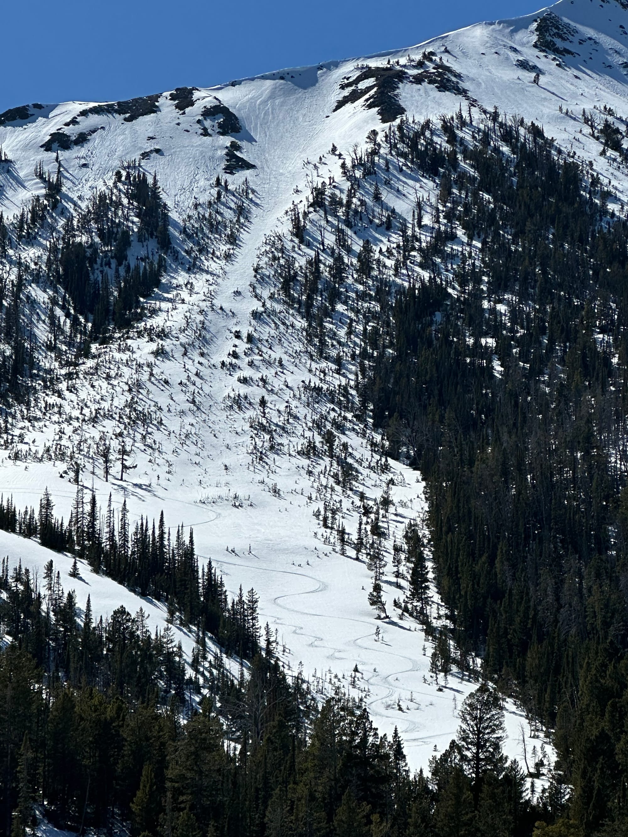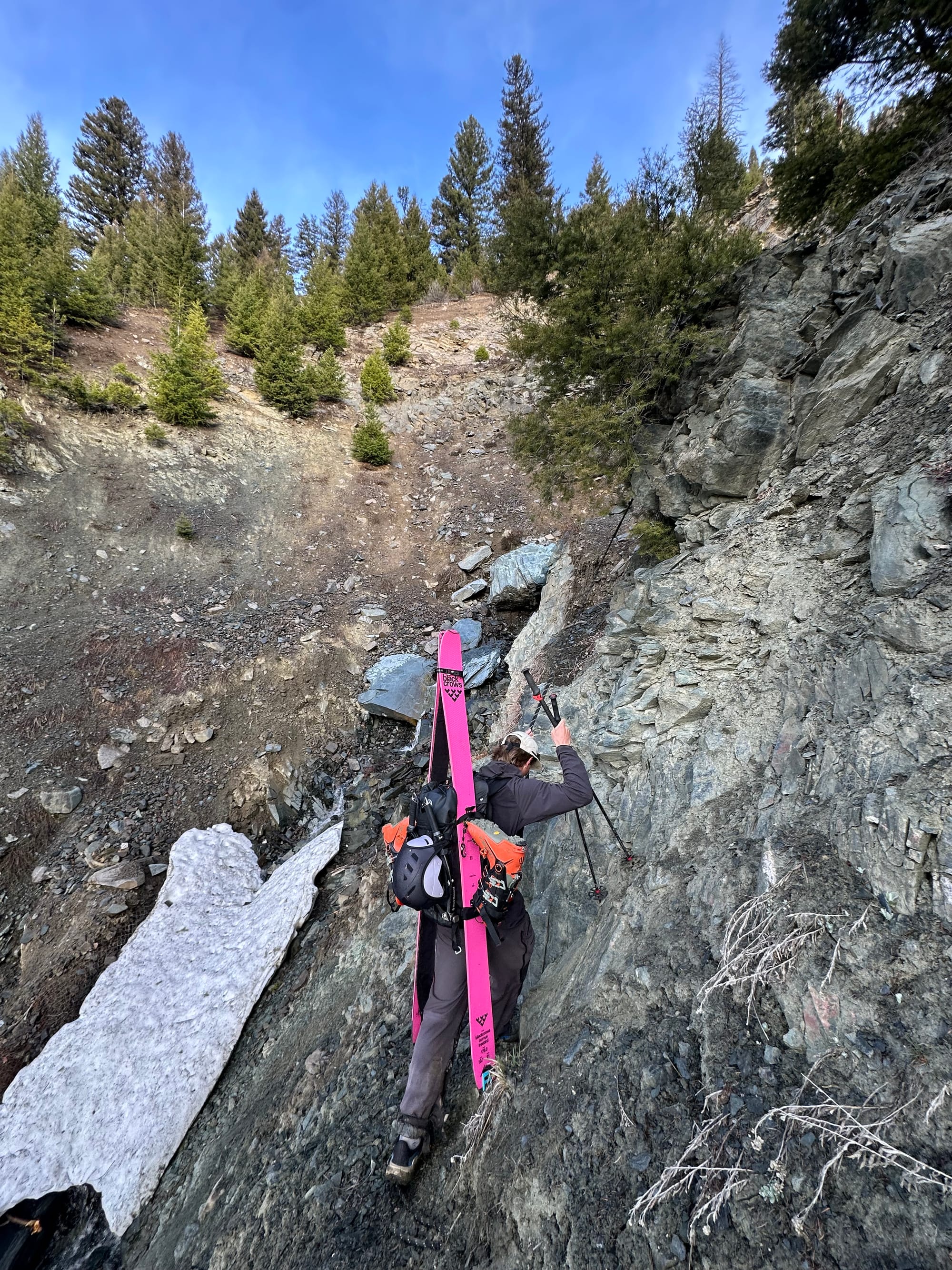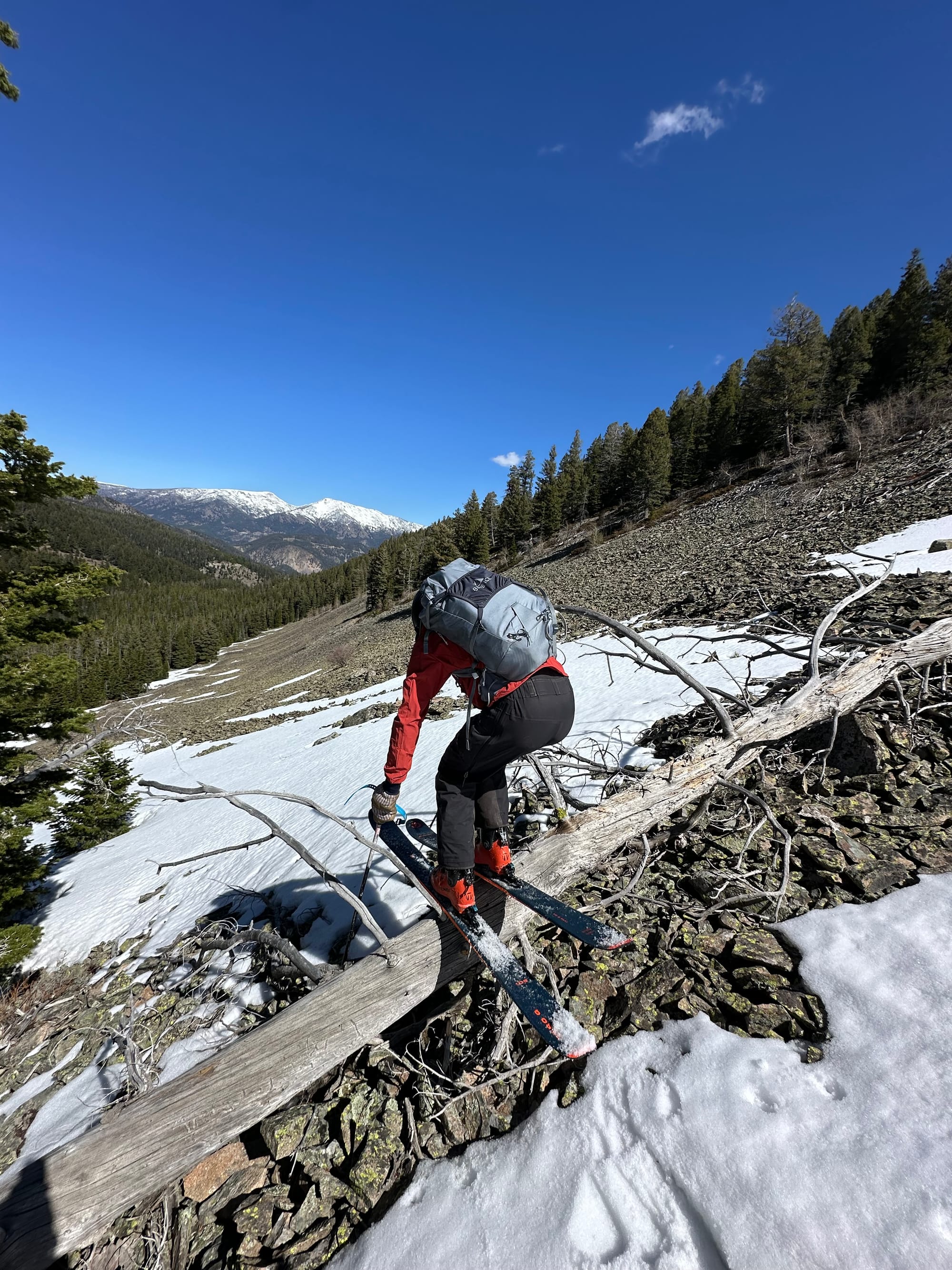 Skiing down the west ridge of Lone Peak was relatively easy and we were making good time, but after descending a couple thousand vertical feet the travel took a turn and open skiing transitioned to thick SW Montana lodgepole and dwindling snow coverage. By the time we made it to Jack Creek at 7500' the snowpack consisted primarily of dirt and downed trees