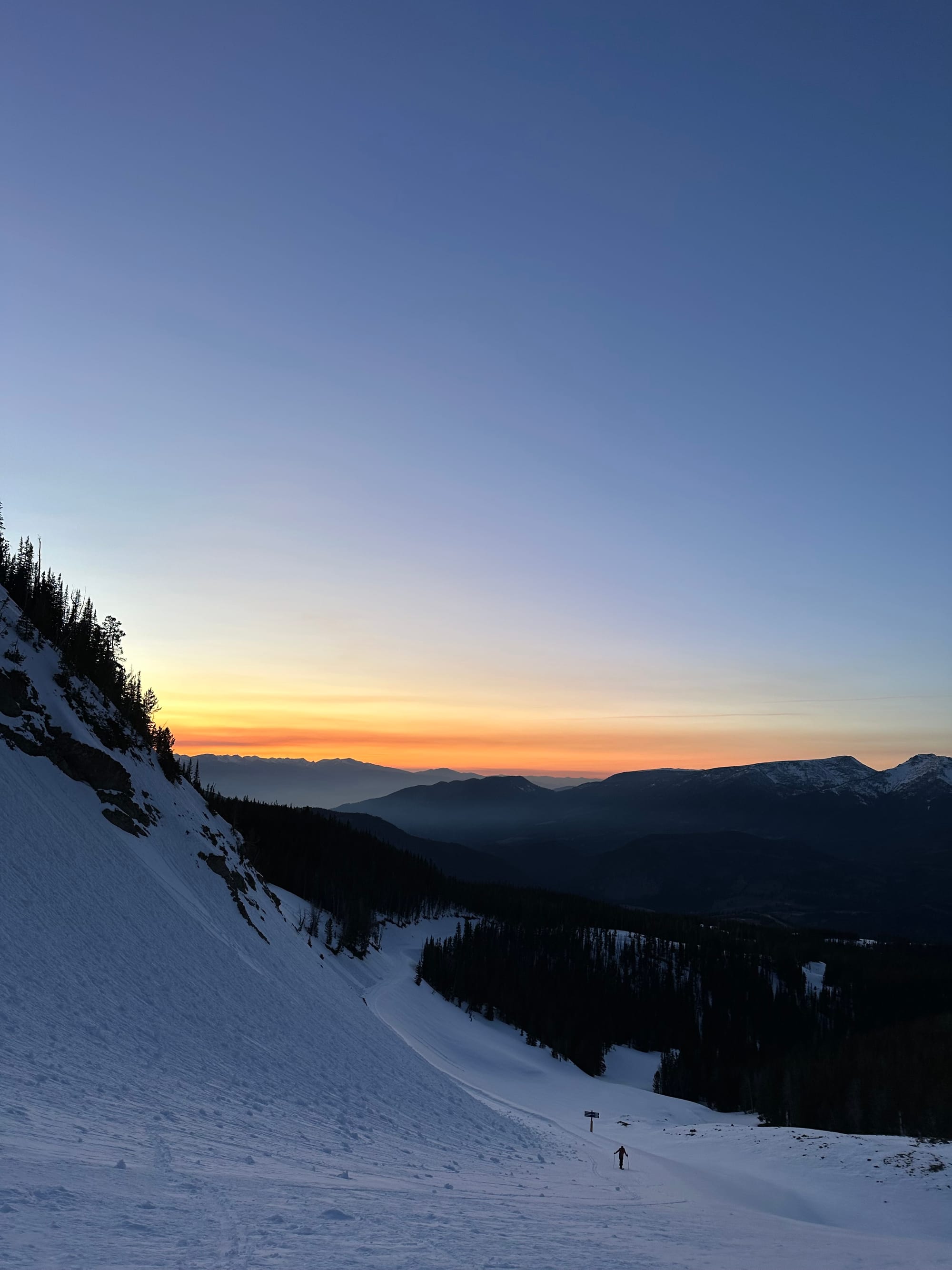 The journey back to the confines of Big Sky Resort proved to be the most arduous part of the day. The slide paths that run down the northerly aspects of Fan Mountain immediately turn to thick forest and this year, these forests held just enough snow to be really annoying and not really skiable at all. Linking a network of roads and some boot packing up some dirt slopes, we eventually made it back into the resort boundary with the clock nearing 7 PM. From the looks of the topo map, one more skin uphill would bring us to a point we could contour our way around the north side of the mountain and back towards our car. This twilight hour of our attempt on Fan proved to be the highlight of the day for me. Under a setting sun, we reached our highpoint and the ambiance was pretty special. No need for the summit today, the sunset and a full day out made up for it, and I'll just have to come back another day.